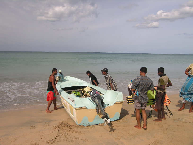 Am Strand von Nilaveli wird das Boot fuer die Ueberfahrt nach "Piggeon Island " klar gemacht.